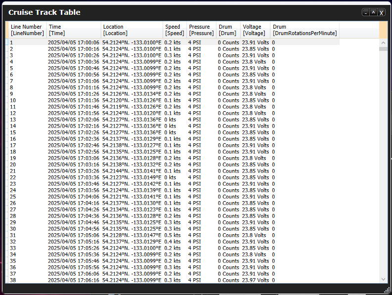 The cruise track table provides a complete listing of every record within the available EM data. The cruise track table identifies each record by line number and lists a default selection of data including time, location, speed (knots), drum (rpm), pressure (psi), video on, and voltage. (Note that you can customize the types of data displayed, as described below.)