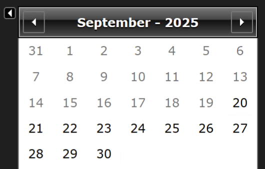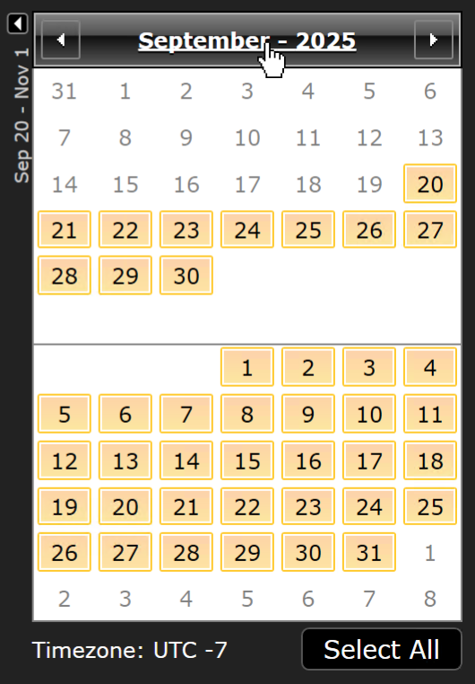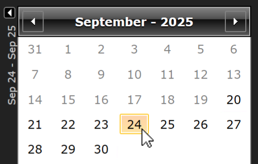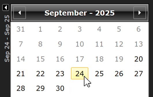 Located in the top right corner, the calendar indicates each day in the vessel’s data set. Selecting a day in the calendar displays the corresponding data on the map and in the time series. Using the calendar, you can narrow the range of displayed data to a single day or expand it to include the full cruise track. (By default, the entire cruise track is selected to start). This section describes ways to select and display data using the calendar.