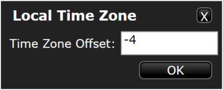 - In the Local Time Offset field, type the number of hours that the desired time zone is ahead (for example, “4”) or behind (for example, “-4”) UTC time. (If you want to just set it to UTC time, type “0”.), and click OK to accept.